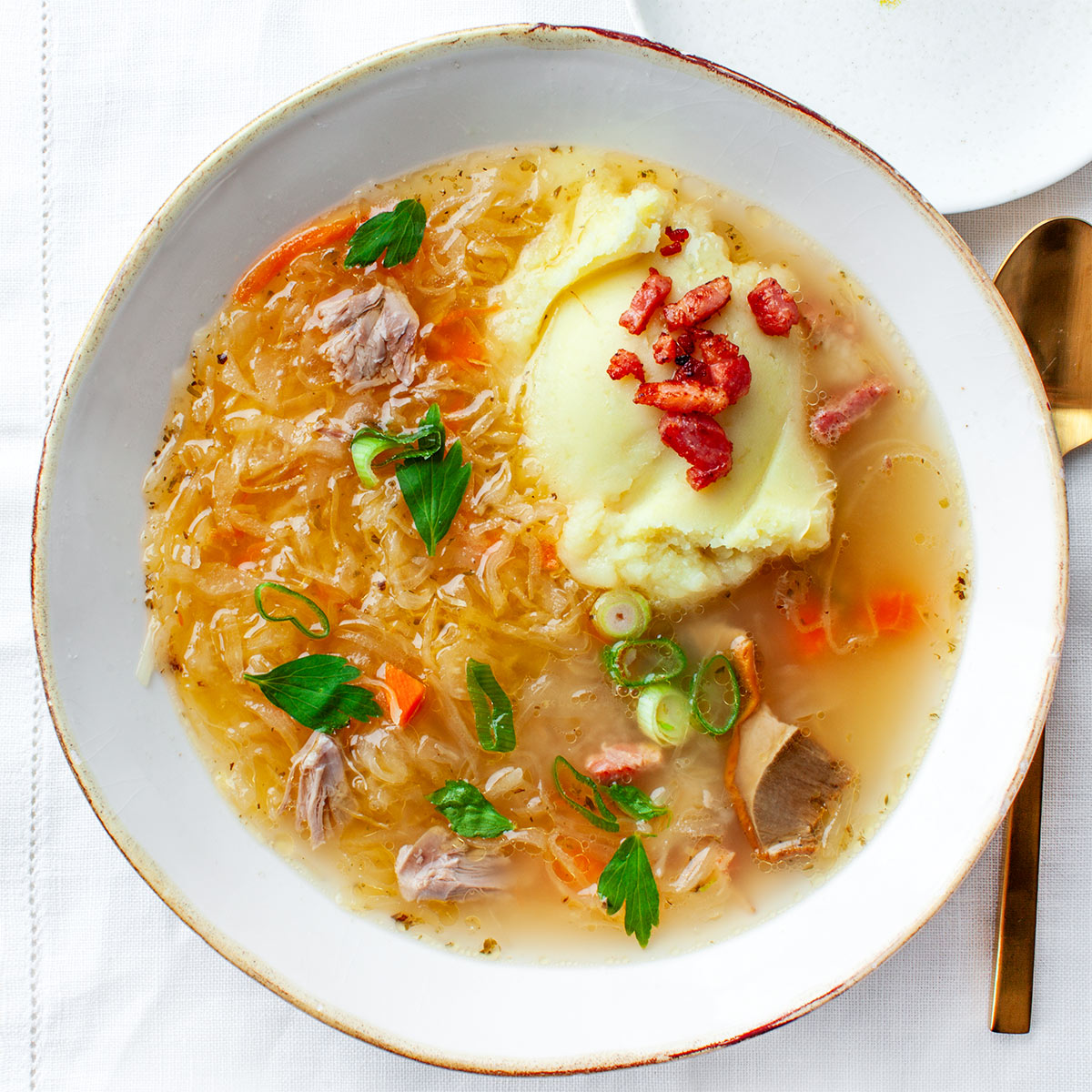 Zupę gotuję na korpusie i szyjkach, czyli takich częściach idealnych na wywar, bulion. Sprawdźcie i użyjcie takie części jakie dostaniecie w swoim supermarkecie. Kwestia podawania ziemniaków (puree) nie została rozstrzygnięta, część domowników jest za ziemniakami włożonymi do talerza, a część woli jednak je podane oddzielnie;) Bardzo dobrze pasował do zupy lubczyk, ale natka pietruszki też będzie dobra.