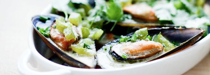 Z mlekiem kokosowym, zieloną papryką i papryczką chili, szczypiorkiem oraz kolendrą. Pyszne, aromatyczne danie i jednocześnie jeden z moich ulubionych sposobów na mule. Małże przygotowuję w bardzo wygodny i sprawdzony sposób. Jeśli raz z niego skorzystacie, możecie już nie chcieć gotować małży "tradycyjną metodą" :-) Sposób ten sprawdzi się przede wszystkim w przypadku małży już otwartych, pasteryzowanych (świeże trzeba dodatkowo wcześniej chwilkę podgotować aby się otworzyły). Wystarczy odłamać jedną połówkę muszli pozostawiając drugą połówkę z przytwierdzoną do niej małżą. Po ułożeniu w naczyniu żaroodpornym polewamy je sosem curry, który chwilę przygotowujemy na patelni. Całość zapiekamy w piekarniku ok. 10 minut.
