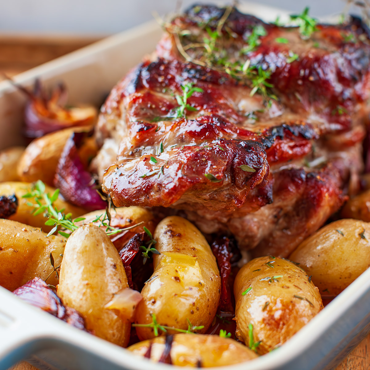 Pieczona karkówka z czerwoną cebulą, suszonymi pomidorami i ziemniakami