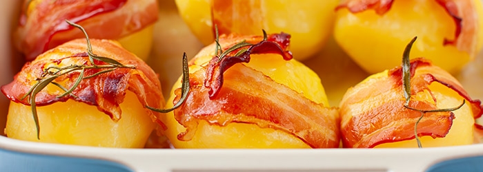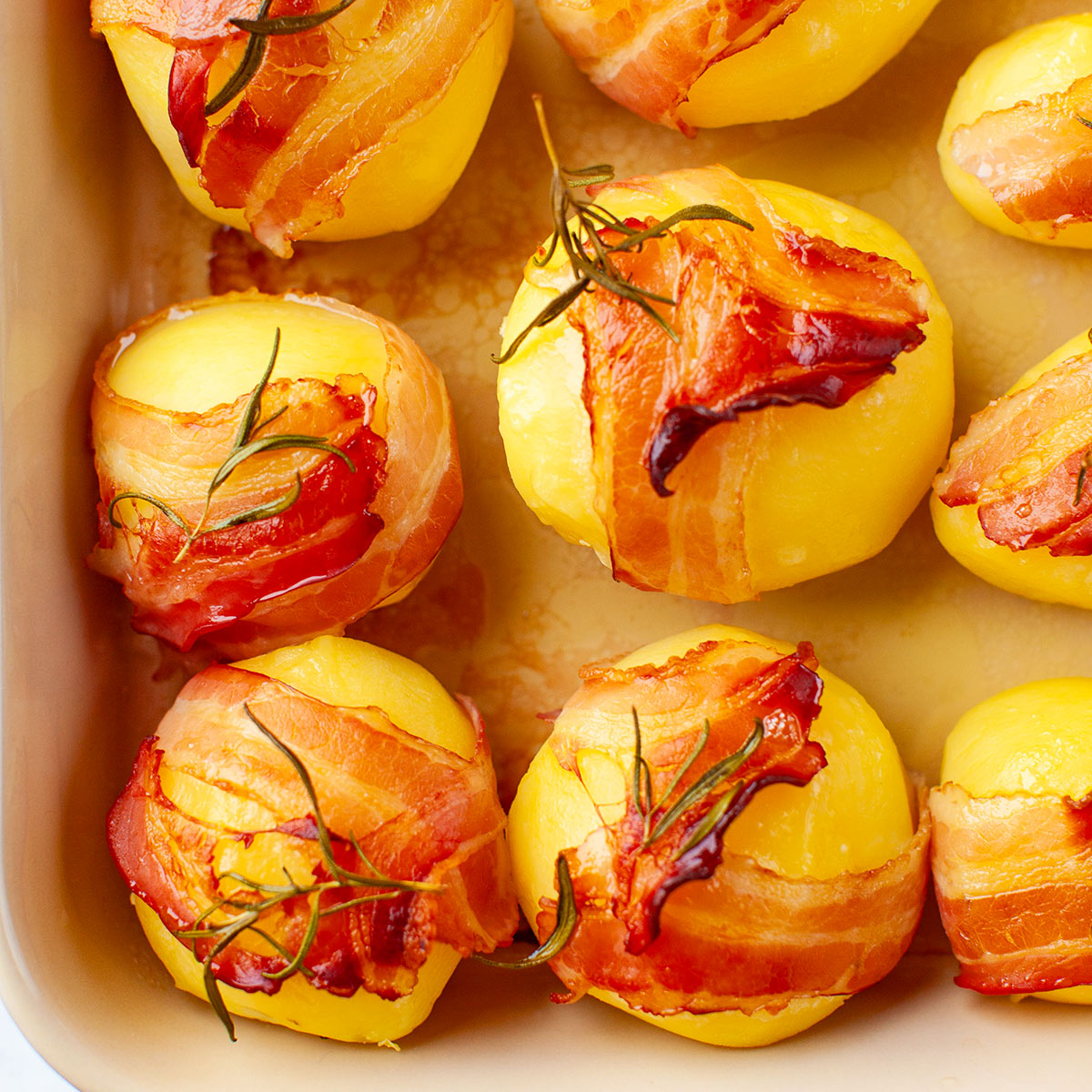 Ziemniaki wcześniej gotujemy (prawie do miękkości), potem zawijamy w plasterki cienkiego boczku i pieczemy w piekarniku. I tyle! Warto zwrócić uwagę na odmianę ziemniaków, najlepiej takich do pieczenia oraz kupić boczek paczkowany, już pokrojony na cieniuteńkie plasterki.