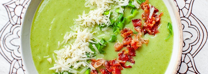Dodatek podsmażonego boczku i parmezanu sprawia, że zupa jest bardziej sycąca. Można ją też podać z grzankami z mozzarellą lub z serem cheddar. Dla podkreślenia zielonego koloru, dodaję do zupy liście bazylii, ale może też być szpinak.