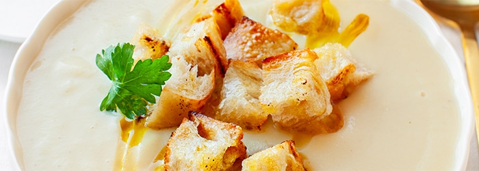 Zupa krem z białych warzyw: z cebuli, pora, pietruszki, selera, ziemniaków, kalafiora oraz białej fasoli z puszki. Z dodatkiem grzanek z bagietki oraz oliwy truflowej, zupa jest bardzo sycąca. I jest naprawdę pyszna! Powiedziałabym, że dodatek oliwy truflowej jest konieczny w tym wypadku, to ona nadaje wyśmienity charakter zupie :)