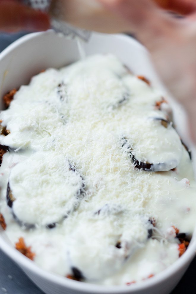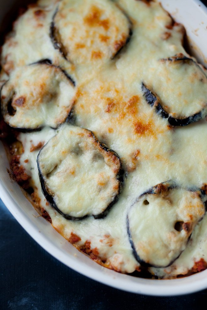 Zapiekanka składająca się z warstw pieczonego bakłażana i farszu z mielonego mięsa (użyłam cielęciny) podsmażanego z pomidorami, przykrytych kremowym sosem beszamelowym.