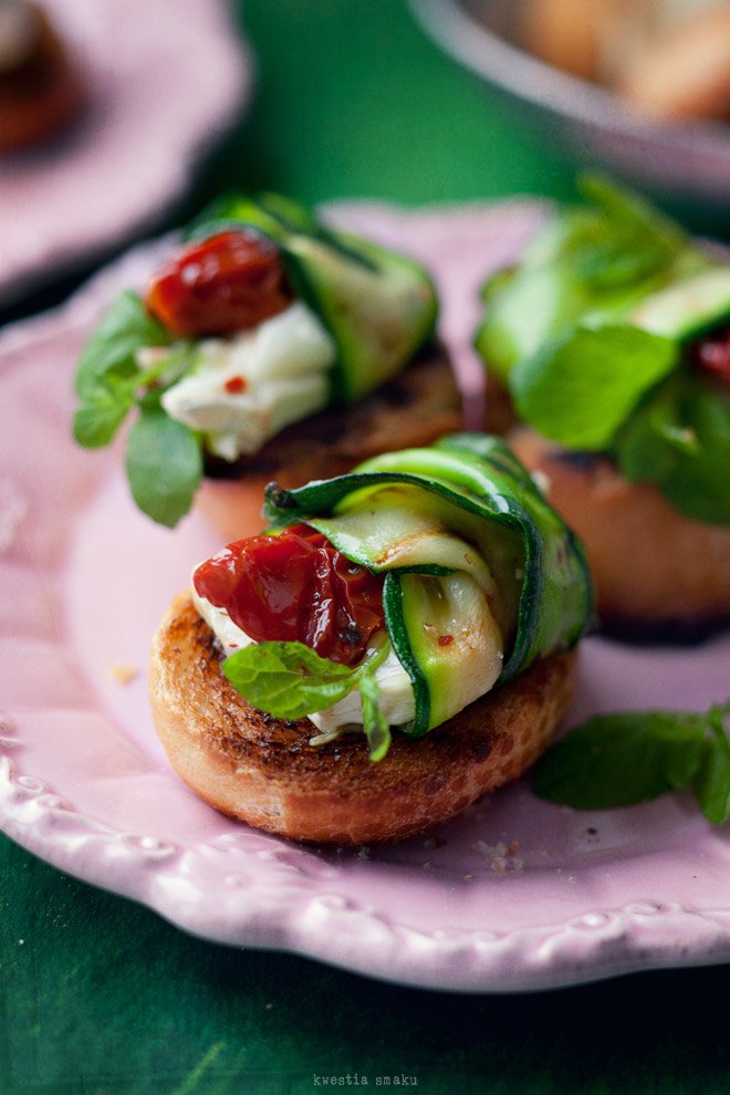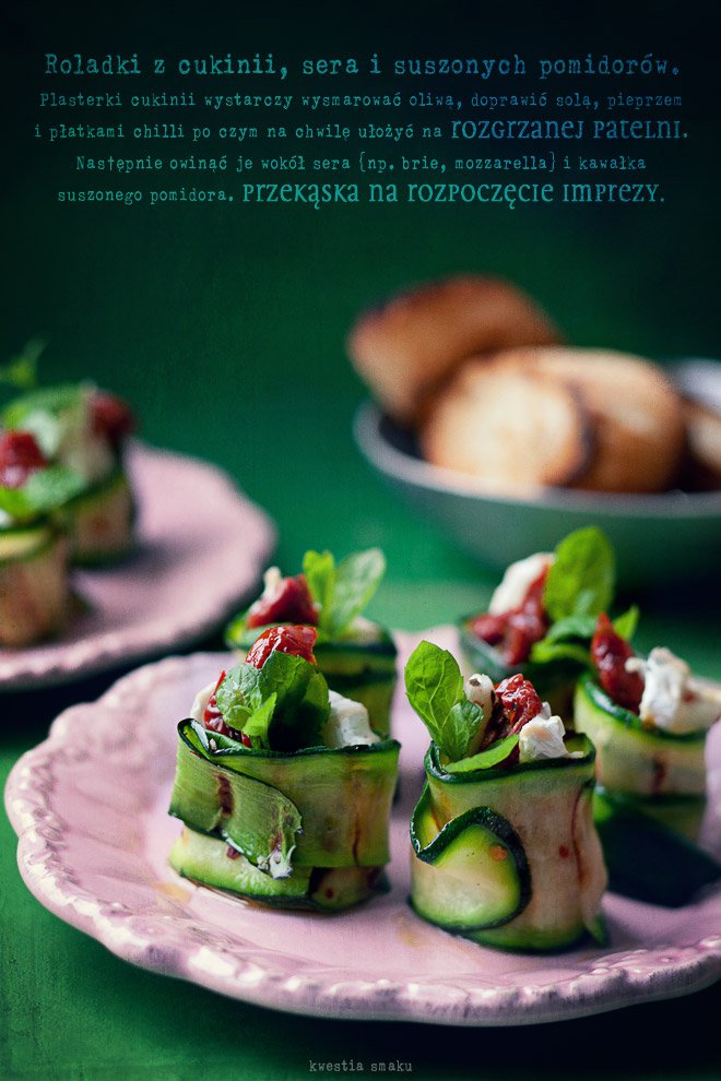 Cukinię wystarczy "pokroić" obieraczką do warzyw na cienkie plasterki i na chwilę ułożyć na rozgrzanej patelni. Wcześniej plasterki cukinii smaruję oliwą, doprawiam solą i pieprzem i posypuję płatkami chilli. Gdy cukinia jest jeszcze ciepła owijam ją wokół kawałka serka (u mnie pleśniowa roladka kozia, ale może też być łagodniejszy brie lub ser z niebieską pleśnią, lub nawet mozzarella), który pod wpływem ciepła mięknie i delikatnie się roztapia. Dodaję też po kawałku suszonego pomidora i zielony listek bazylii, rukoli, klolendry czy mięty.
