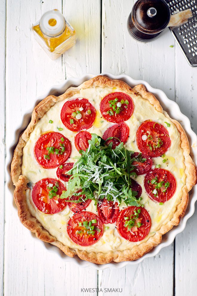 Lekka tarta na cienkim i chrupiącym spodzie z gotowego ciasta francuskiego, wypełniona masą z serka ricotta i parmezanu oraz z plasterkami pomidorów. Spód wcześniej podpiekam, a masę doprawiam skórką cytrynową oraz szczypiorkiem. Dekoruję rukolą, szczypiorkiem i tartym parmezanem. Polecam nie tylko dla osób nie jedzących mięsa, na pewno posmakuje wszystkim. Dla chętnych: można dodać pokrojoną i podsmażoną pierś kurczaka, wówczas zmniejszamy ilość ricotty. Sprawdzi się też chorizo lub szynka parmeńska.