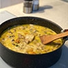 - Wlać gorący bulion i całość zagotować. Gotować na umiarkowanym ogniu przez około 3 minuty aż dynia będzie miękka.