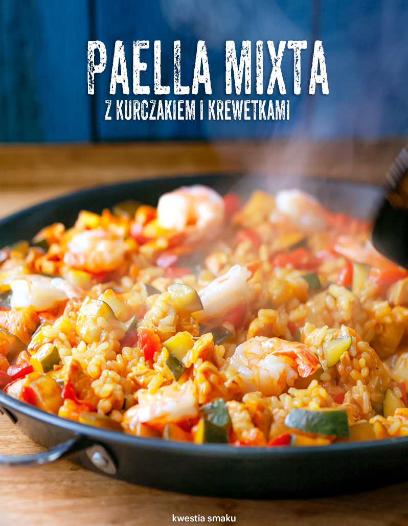 To szybki obiad dla całej rodziny, naprawdę duża porcja aromatycznego, pełnego smaku jedzenia, bardzo prostego do zrobienia z powszechnie dostępnych składników. Kurczaka dodajemy na początku przygotowywania paelli i dokładnie go obsmażamy, natomiast krewetki na koniec (możemy je też pominąć).
