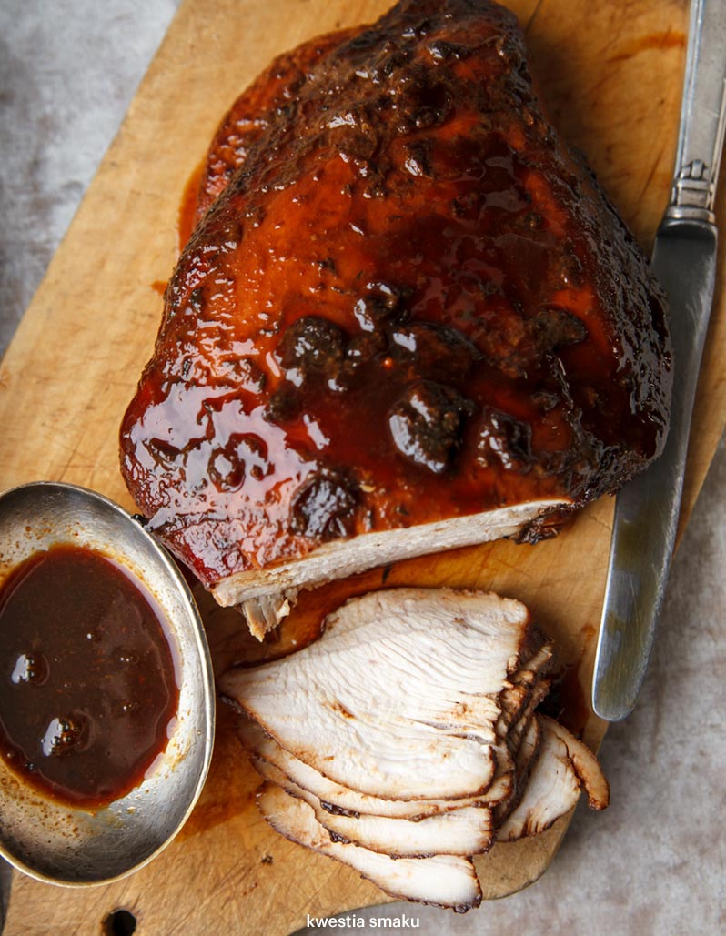 Ostatnia pieczeń z karkówki w ciemnej glazurze z melasy i whisky skłoniła mnie do przygotowania podobnej marynaty i sosu, ale z bardziej dostępnych i powszechnych składników, oraz bez użycia alkoholu. Wybór padł na filet z indyka, a ciemny, słodki sos uzyskałam łącząc ciemny sos sojowy, miód, powidła śliwkowe i trochę octu. Nie ma w nim posmaku melasy, ale kolor i smak jest rewelacyjny.