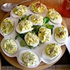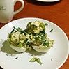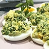- Farsz nałożyć w wycięte części jajek, tak aby zmieściło się go jak najwięcej. Jajka ułożyć na półmisku. Udekorować zieleniną i majonezem.