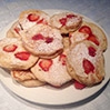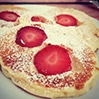 - Gdy placki podrosną (mniej więcej w drugiej połowie smażenia) włożyć w każdego placka po 2 grubsze plasterki truskawki.