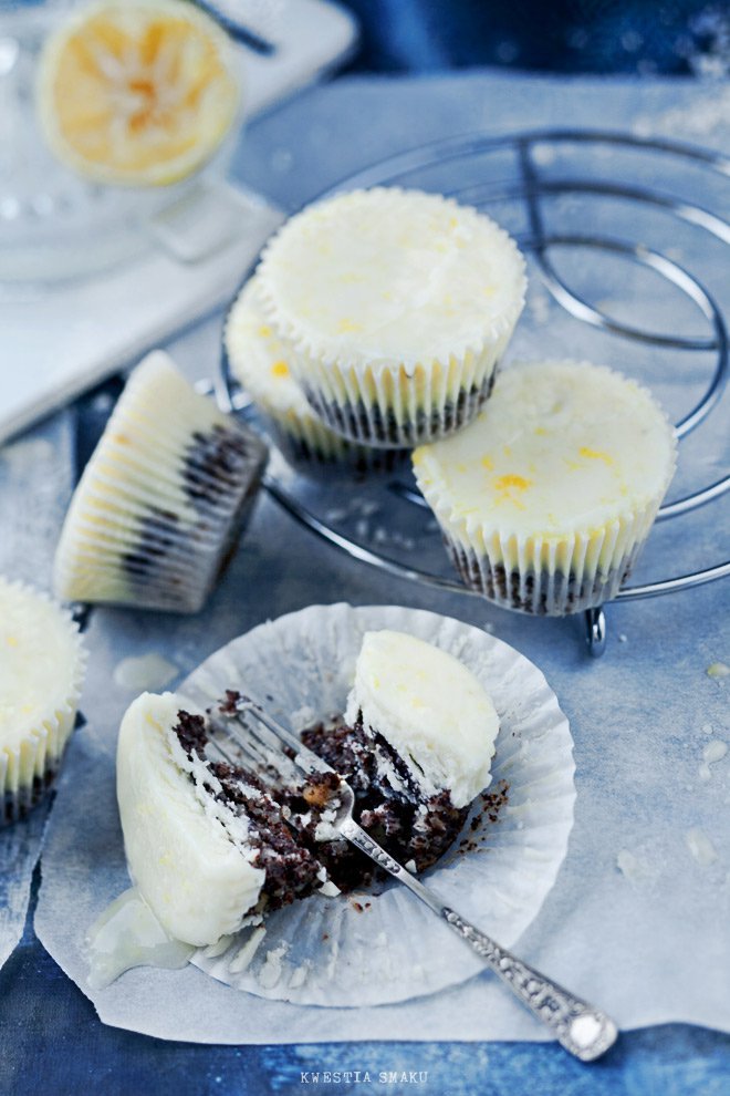 Babeczki z masą makową i masą serową, czyli mini makowce z sernikiem w jednym :-) Pokryte cytrynowym lukrem. Szybkie do zrobienia, bez konieczności użycia miksera, również z gotowej masy makowej. Masę makową wzbogacam mielonymi płatkami migdałów (tylko do gotowej masy makowej ze sklepu), orzechami, wiórkami kokosowymi i czekoladą. Masa serowa to moja klasyczna masa z białego sernika.