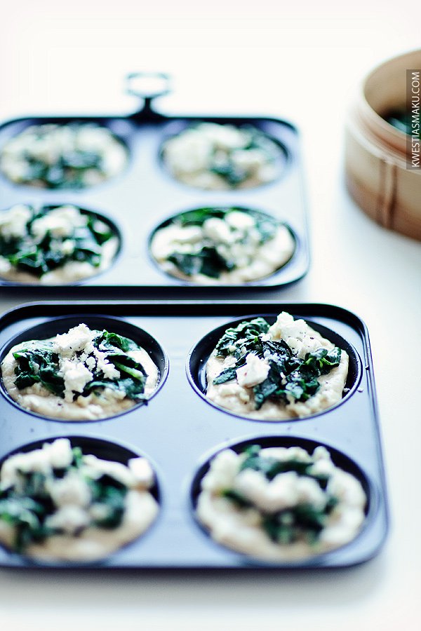 - Na placki z ciasta wyłożyć szpinak z sosem, na wierzch położyć po 3 kostki sera koziego, skropić 1/2 łyżeczki oliwy z oliwek.