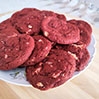 Słynne amerykańskie ciasteczka w kolorze tortu Red Velvet Cake. Z kawałkami białej czekolady oraz gruboziarnistą solą morską, która świetnie przełamuje słodki smak ciastek.