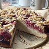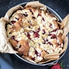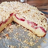 - Wyłożyć do tortownicy, na wierzch ułożyć pokrojone truskawki. Posypać kruszonką - rozdrobnionym w dłoniach ciastem z zamrażalnika.