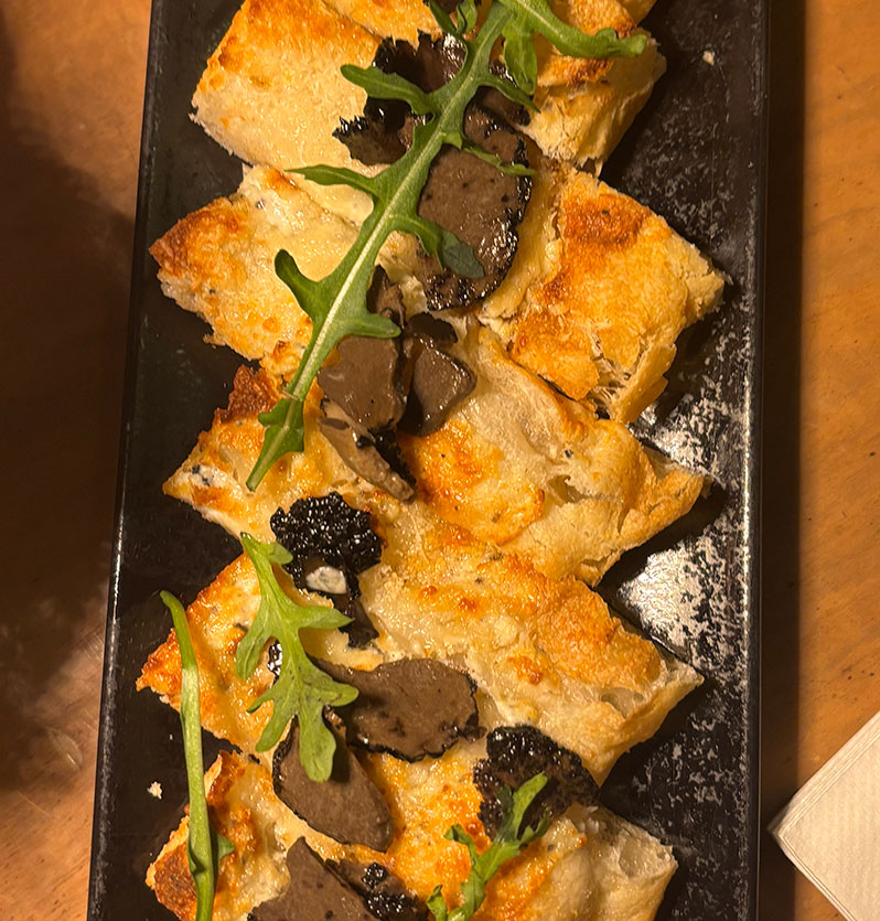 Focaccia z truflami i serem pleśniowym (np. gorgonzolą), z rozmarynem i solą morską gruboziarnistą.