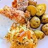 Z pieczonymi ziemniakami i surówką z kiszonej kapusty