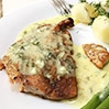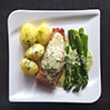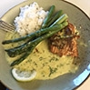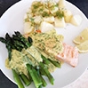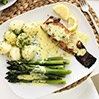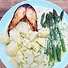 - Na talerze położyć upieczonego łososia, obok zielone dodatki, ziemniaczki i polać sosem koperkowym.
