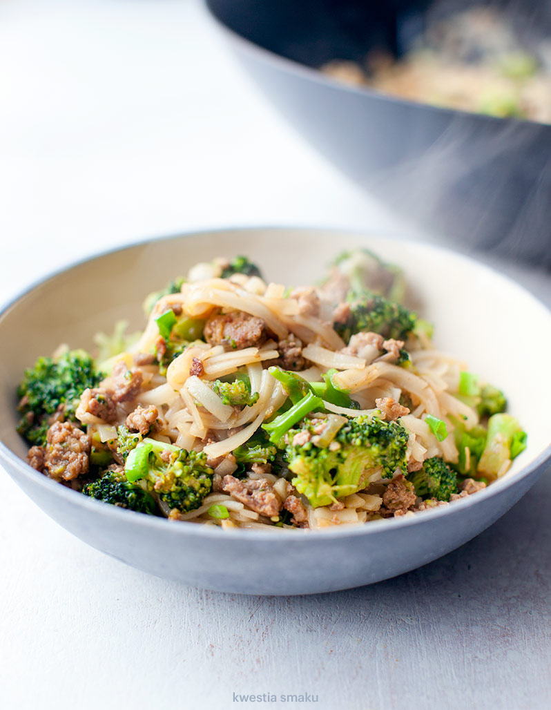 kwestiasmaku Makaron ryżowy smażony z brokułami i drobiowym mięsem mielonym