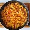 - W garnku zagotować osoloną wodę, wrzucić makaron i gotować aż będzie al dente, odcedzić, zachować ok. 1/4 szklanki wody z makaronu.