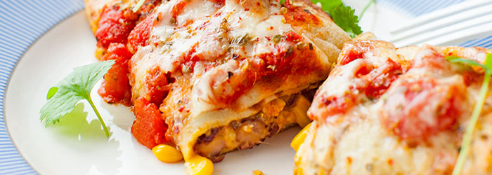 Pyszne naleśniki z nadzieniem z mielonego mięsa, kukurydzy i fasoli, doprawione po meksykańsku, zapiekane z sosem pomidorowym i serem.