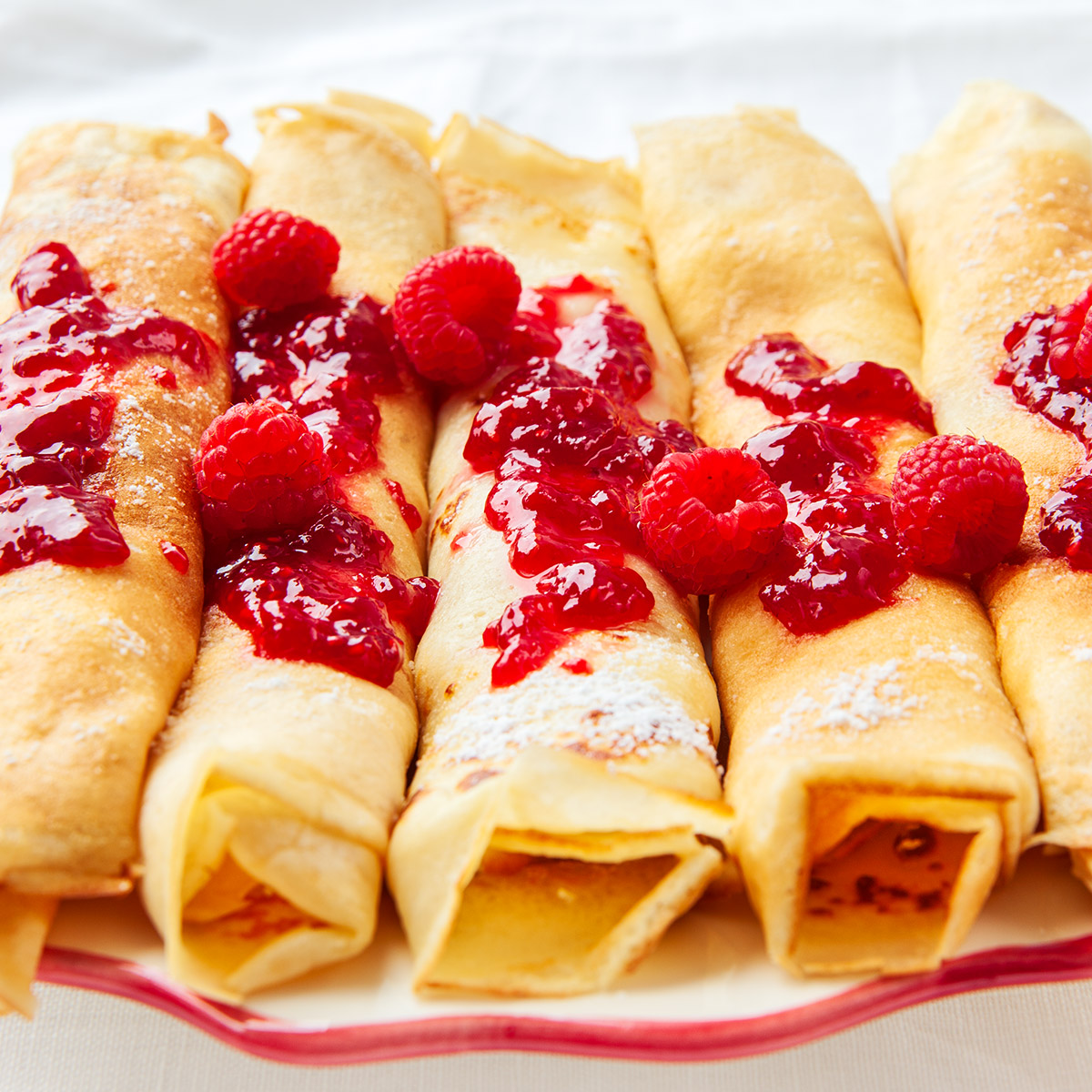Do ciasta naleśnikowego wykorzystujemy skyr pitny, reszta to składniki dodawane do zwykłych naleśników (jajko, mąka, mleko, olej). Do nadzienia daję twaróg oraz skyr gęsty (jogurt typu islandzkiego). Nadzienie posłodziłam miodem. Do podania polecam konfiturę malinową i maliny (teraz mrożone, w sezomie świeże).