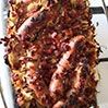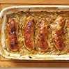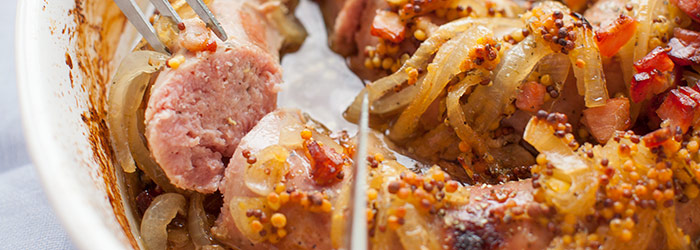 Pieczona biała kiełbasa z dodatkiem dużej ilości cebuli i chrupiących kawałeczków boczku. W zalewie z dodatkiem musztardy francuskiej (ziarnistej), sosu sojowego miodu i wina. Warto tutaj postarać się o dobrej jakości świeżą (surową) białą kiełbasę, wówczas danie będzie naprawdę pyszne.
