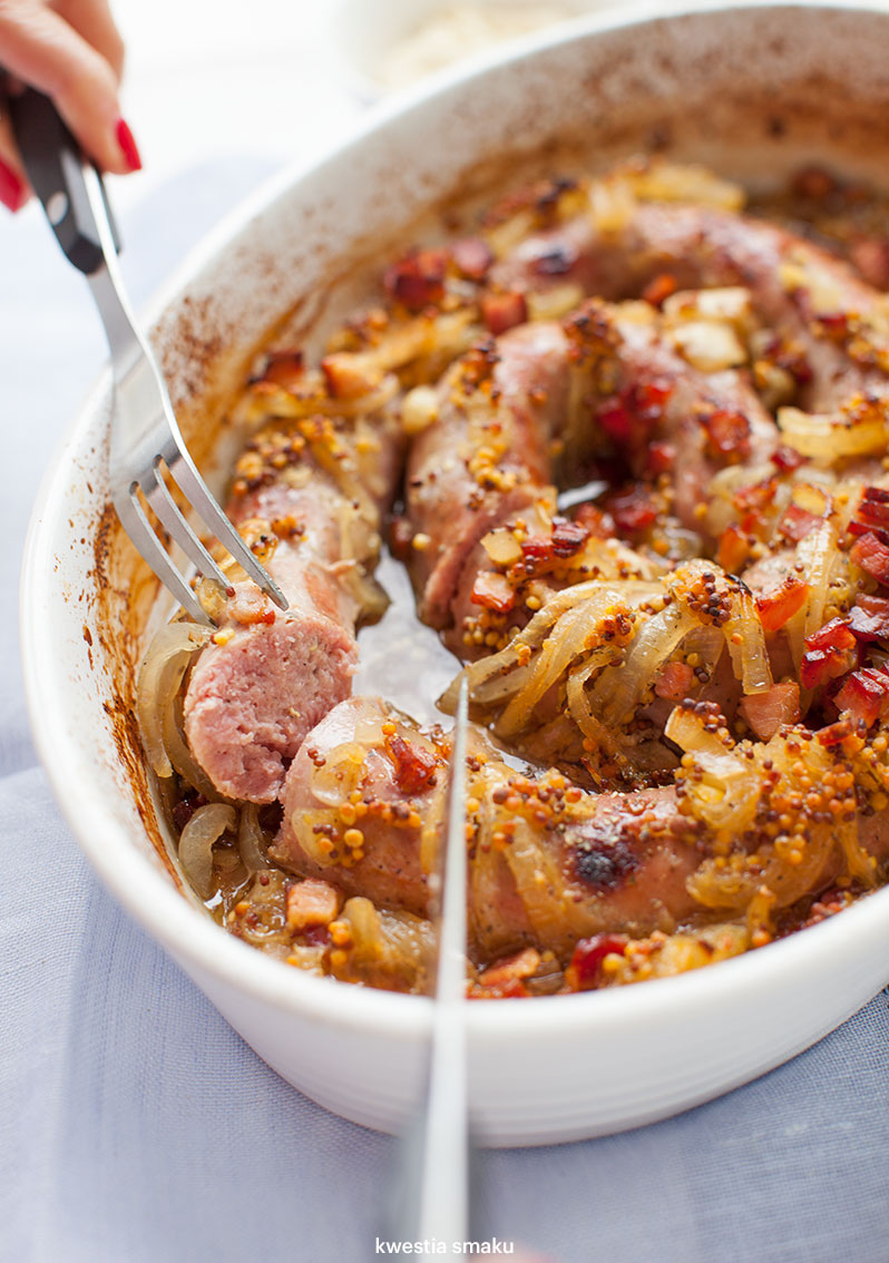 Biała kiełbasa pieczona z cebulą, boczkiem i musztardą francuską (ziarnistą). Świetna z chrzanem lub/i ogórkiem kiszonym.