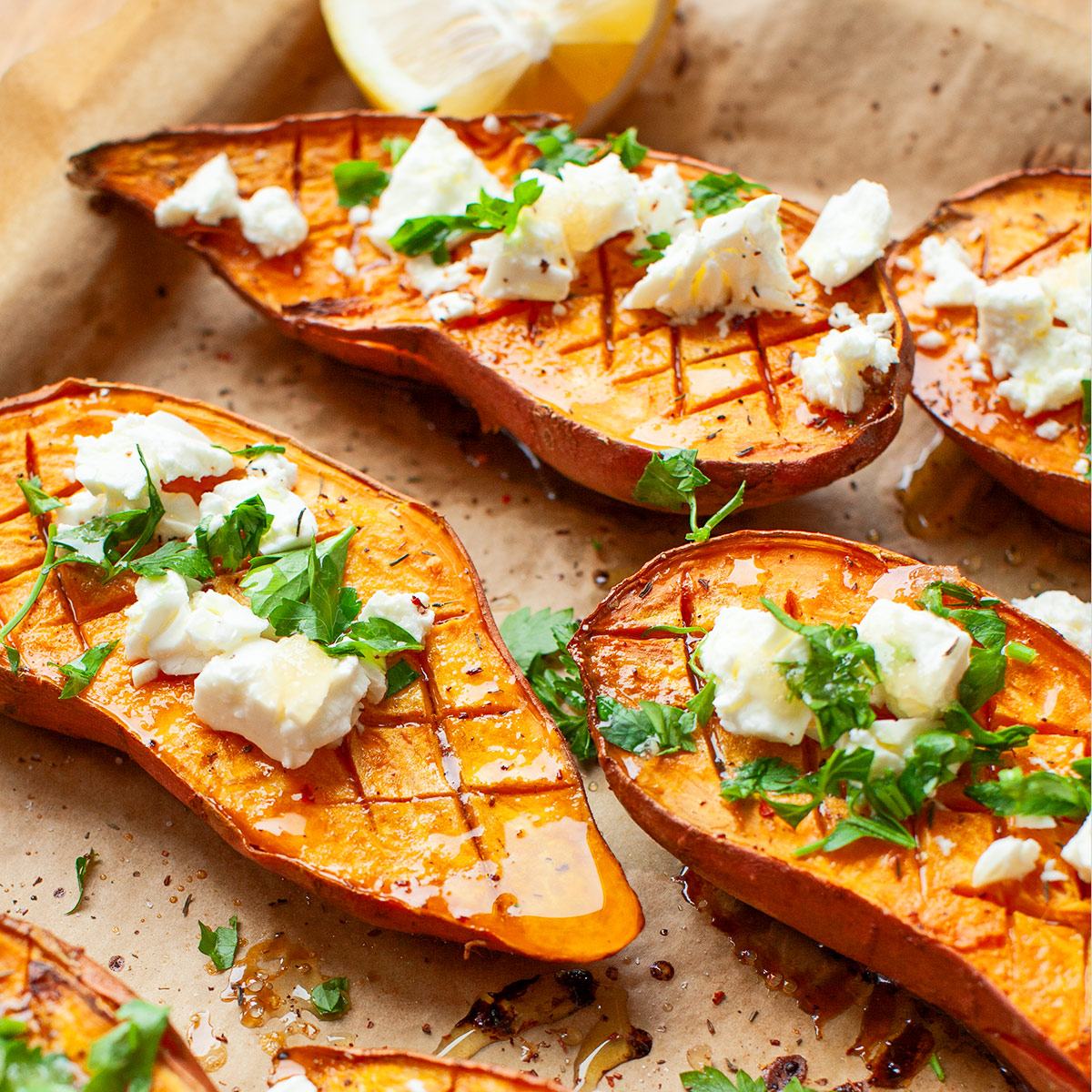 - Wyjąć bataty z piekarnika, posypać pokruszoną fetą, skropić sokiem z cytryny, miodem oraz dodatkową oliwą (można też połączyć te składniki w jeden sos, w równych proporcjach).