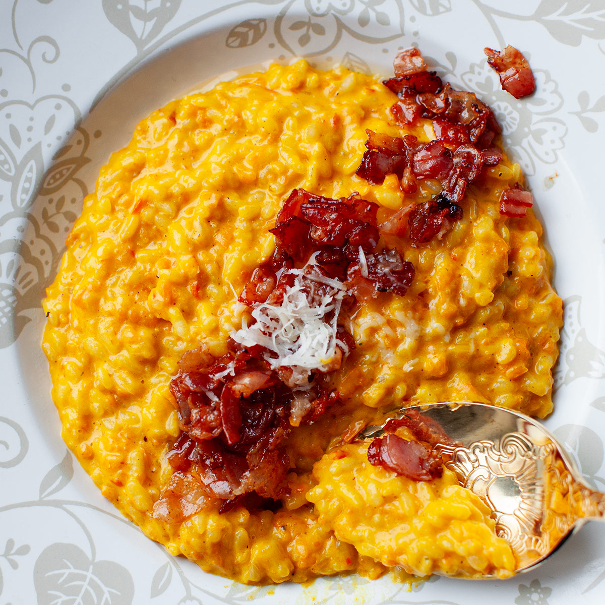 Risotto z dynią, które równie dobrze smakuje z podsmażonymi chipsami z boczku jak i orzechami pekan.