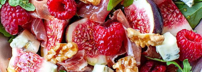 Pyszna sezonowa sałatka z figami, szynką parmeńską, orzechami włoskimi i serem z niebieską pleśnią.