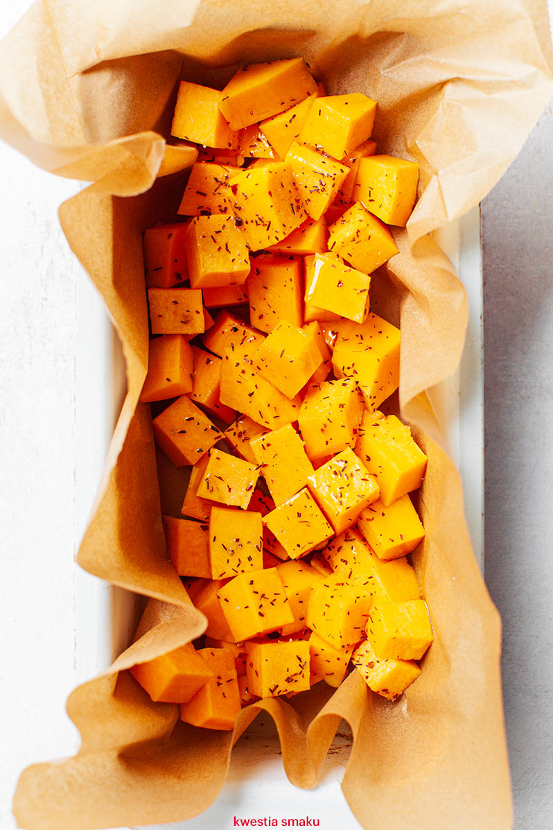 - Upiec dynię: piekarnik nagrzać do 180 stopni C. Dynię obrać ze skórki i pokroić w kosteczkę. Doprawić solą, pieprzem, płatkami chili i skropić łyżeczką oliwy. Ułożyć na blaszce wyścielonej papierem do pieczenia i piec w piekarniku przez 30 minut.