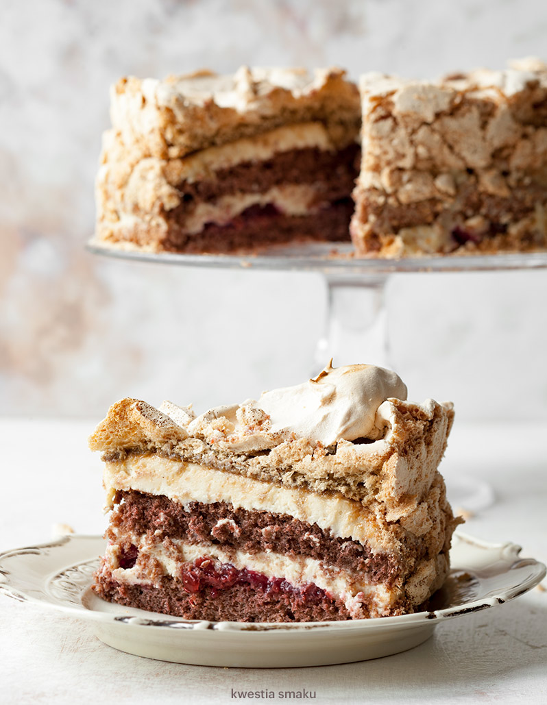 To wyjątkowy tort przełożony pyszną masą chałwową i wiśniami, na wierzchu udekorowany kawową bezą. Kakaowe blaty nasączone są herbatą korzenną, można kupić taką gotową (sprawdzi się np. rozgrzewająca z cynamonem) lub zrobić własną. Do tortu najlepsze będą domowe wiśnie z syropu, spirytusu.