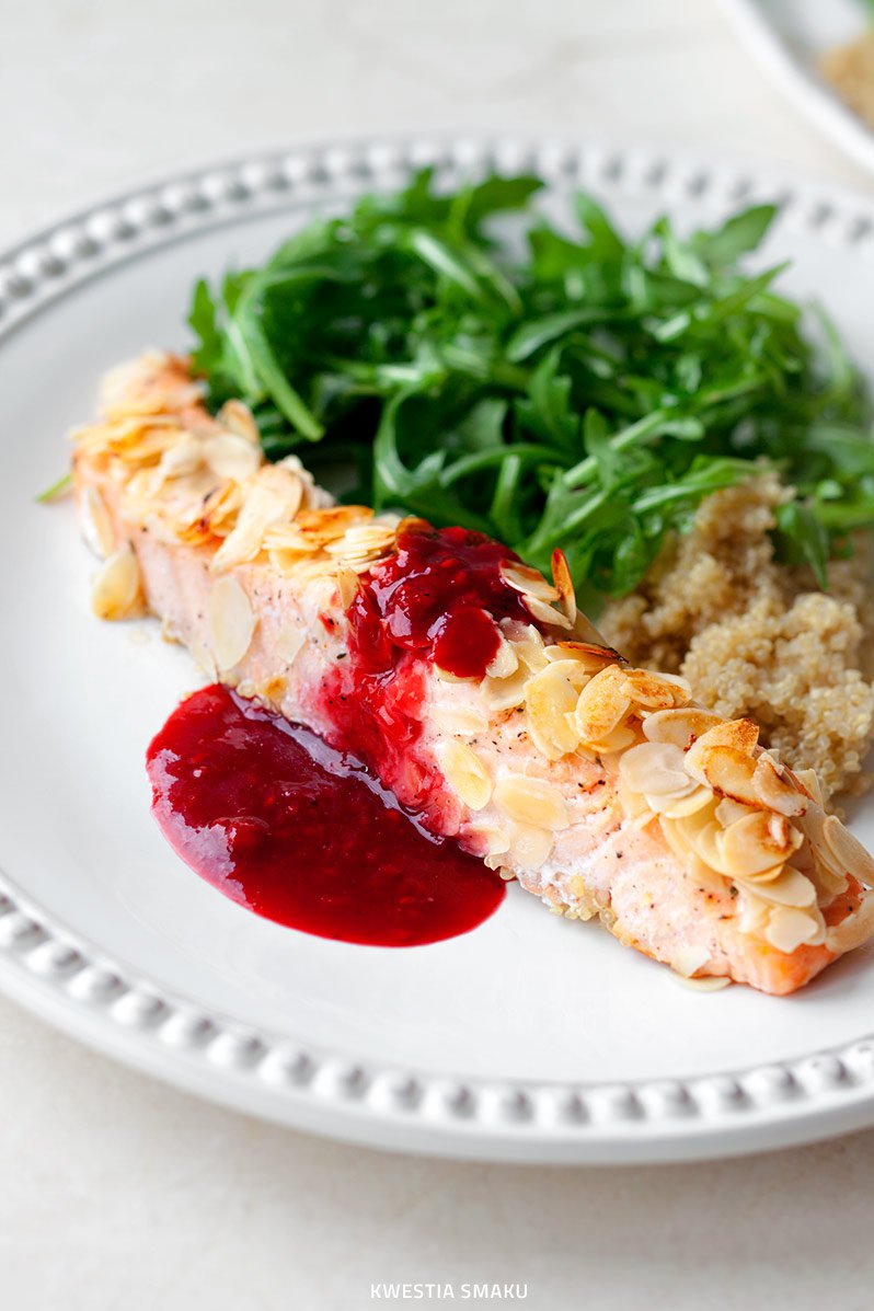 Łosoś pieczony w chrupiących płatkach migdałów, podawany z sosem malinowym, rukolą i komosą ryżową. Proste i pyszne :-) Poza sezonem sos malinowy zrobimy z powodzeniem z mrożonych malin, dla aromatu polecam dodać do niego trawę cytrynową i - jeśli lubicie - sos rybny. Jeśli nie posiadacie tych dodatków, trudno, można je pominąć a sos doprawić sokiem z cytryny. Danie sprawdzi się zarówno na piątkowy obiad jak i na bardziej uroczyste okazje.