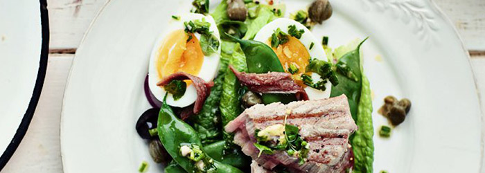 Oryginalna sałatka z grillowanym tuńczykiem, jajkiem, czerwoną cebulą, zieloną fasolką, czarnymi oliwkami, anchois i kaparami. Z pysznym dressingiem z dodatkiem szczypiorku i oregano. Do sałatki można też dodać ugotowane młode ziemniaczki i pomidorki koktajlowe. Świeżego tuńczyka można też zastąpić tuńczykiem z puszki dobrej jakości.