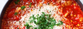 Kaszotto warzywne z kurczakiem, papryką, marchewką i kukurydzą, doprawione imbirem i curry