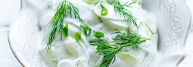 Tradycyjna surówka z ogórka, gęstej śmietany, koperku i szczypiorku.
