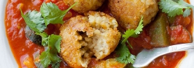 Pulpeciki z soczewicy i kaszy jaglanej, w sosie pomidorowym z cukinią.