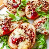 Pieczone gruszki z serem pleśniowym, żurawiną i orzechami