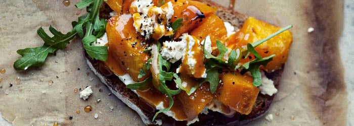 Grzanki z pieczoną dynią, serem białym i rukolą