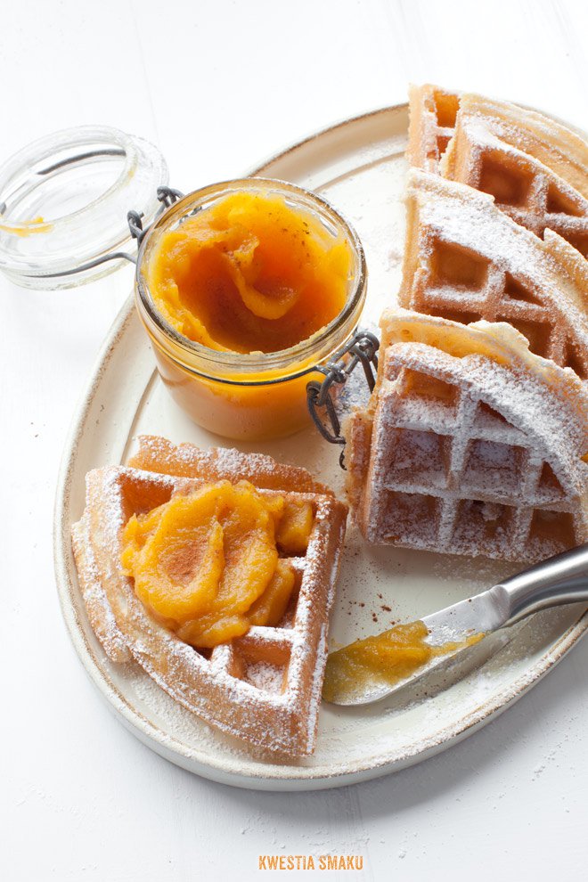 Pyszny mus z pieczonej dyni i prażonych jabłek. Do naleśników, gofrów, ciast (np. do biszkoptu lub szarlotki), ale również do dań wytrawnych, np. jako dodatek do pieczonej gęsi czy kaczki. Mus doprawiony jest pomarańczą, gałką muszkatołową i cynamonem. Jabłka prażymy jak do szarlotki (najlepsze więc będą jabłka kwaśne jak szara reneta, boiken) i dodajemy purée z upieczonej dyni. Gotujemy przez kilkanaście minut, aby na koniec uzyskać gęsty i aromatyczny mus.