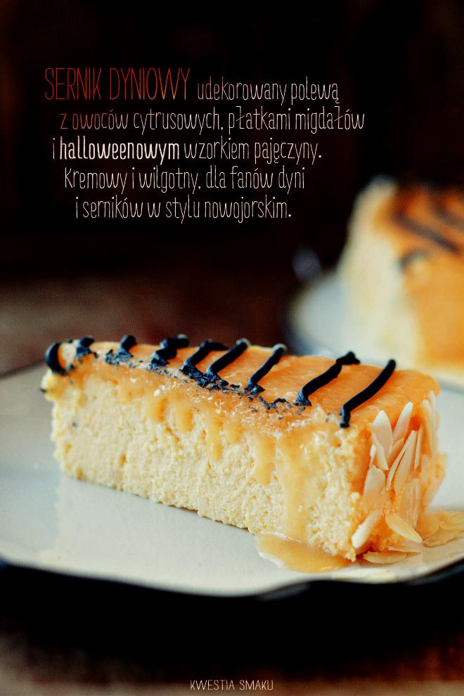 Sernik w stylu nowojorskim pieczony — znaną już chyba wszystkim — metodą z obniżoną temperaturą. Kremowy i wilgotny dzięki purée z pieczonej dyni. Udekorowany polewą z owoców cytrusowych (cytryny, pomarańczy i mandarynki), przygotowanej na bazie żółtek.