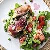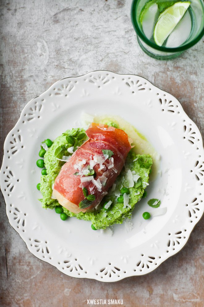 Filety z kurczaka faszerowane serem, pieczone w postaci roladek w szynce parmeńskiej. Podawane na pesto z zielonego groszku i bazylii. Całość możemy posypać tartym parmezanem i miętą.