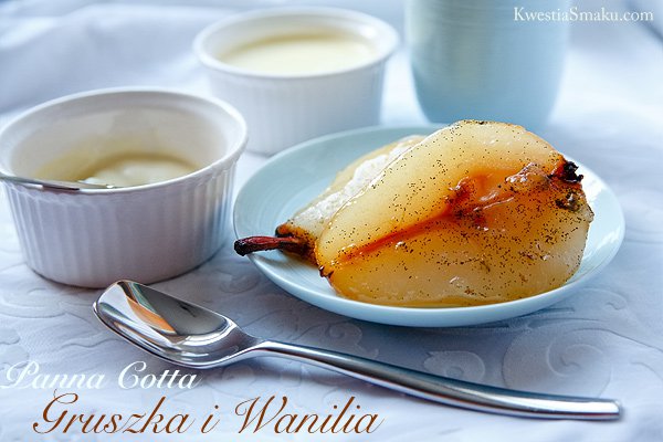 - Pieczone gruszki: Piekarnik nagrzać do 200 stopni. Gruszki obrać i przekroić na połówki. Ułożyć jedna obok drugiej w naczyniu żaroodpornym, skropić sokiem z cytryny. Wanilię przekroić wzdłuż na pół i łyżeczką wyłuskać ziarenka, rozsmarować je po gruszkach, posypać cukrem. Przykryć folią aluminiową i piec przez 30 - 35 minut, aż gruszki będą miękkie ale nie będą się jeszcze rozpadać. Ciepłe gruszki podawać ze schłodzoną panna cottą.