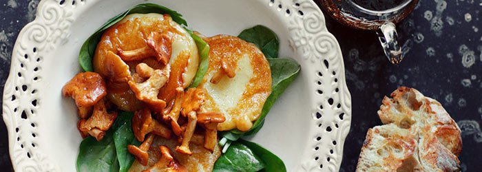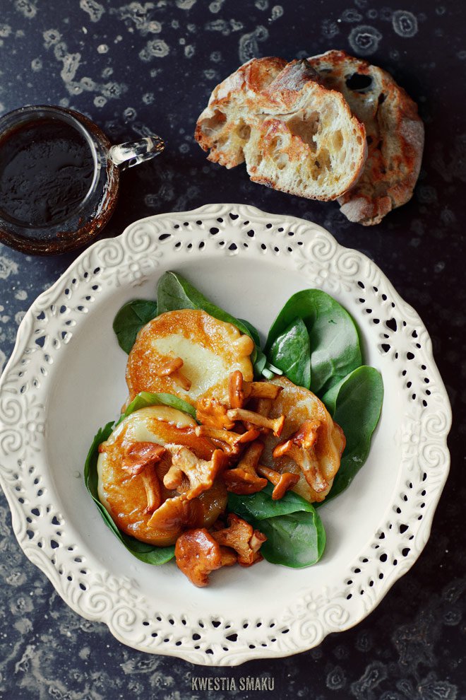 - Ser zdjąć z patelni i ułożyć na zieleninie, posypać kurkami (jeśli ostygły, można je szybko podgrzać na patelni), polać sosem balsamico i opcjonalnie posypać natką pietruszki i świeżo zmielonym pieprzem. Podawać z grzankami.