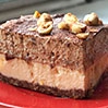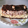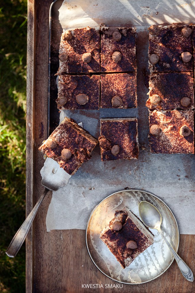 - Położyć uprażone orzechy laskowe (np. po 1 orzechu na 1 kosteczkę ciasta) oraz posypać przez sitko kakao zmiksowane w młynku do kawy z cynamonem i cukrem brązowym. Lub polać fantazyjnie polewą czekoladową.