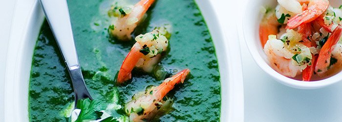 Dzisiaj bardzo gęsta zupa szpinakowa, z dodatkiem ziemniaków. Na bazie oliwy z oliwek. Podawana z krewetkami smażonymi z cebulką i natką pietruszki. Zamiast krewetek, można z powodzeniem użyć np. grillowanego łososia. Można też zupę podać z grzankami z oliwą i np. łososiem wędzonym.