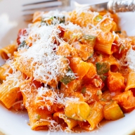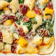 Kopytka zapiekane z dynią, serem pleśniowym i szpinakiem