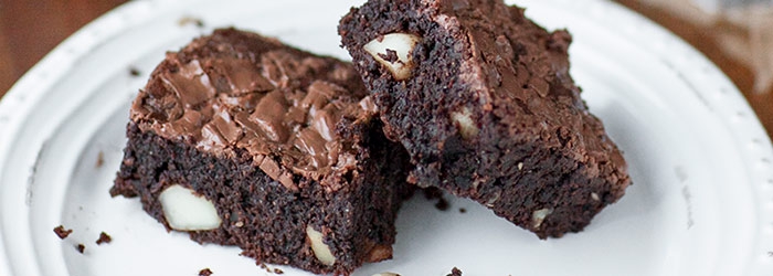 Brownie - najpopularniejsze ciasto czekoladowe, błyskawiczne do przygotowania i na każdą okazję. Wilgotne i gęste, możliwe do zrobienia bez konieczności używania miksera. Teraz moje ulubione to takie z dodatkiem mąki żytniej razowej, ciemnym cukrem muscavado i orzechami (mieszanką włoskich i macadamia). Przykryte cieniutką warstwą mlecznej czekolady. Ciemny cukier muscavado daje mu nieco bardziej mazistej i ciągnącej konsystencji, a w połączeniu z mąką razową - głębszy smak. Ciasto można też zrobić w podstawowej wersji - ze zwykłej mąki i zwykłego cukru.