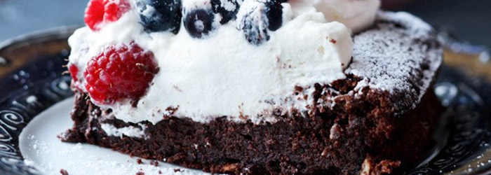 To mój faworyt wśród ostatnich wypieków :-) Czekoladowe ciasto bez mąki i proszku do pieczenia, które po upieczeniu opada tworząc wgłębienie - miejsce na krem i owoce. Czekoladową "misę" wypełniłam kremem z mascarpone i śmietany oraz świeżymi owocami (malinami i borówką), możecie dać też truskawki. Samo ciasto czekoladowe jest jednym z najsmaczniejszych i jednocześnie najłatwiejszym do zrobienia. Puszystości nadają mu ubite białka, jest też odpowiednio wilgotne i miękkie. Polecam!
