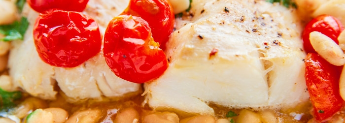 To proste i szybkie danie dla miłośników zdrowej kuchni śródziemnomorskiej. Kawałki polędwiczki z dorsza pieczone z fasolką, oliwą i dla chętnych - odrobiną białego wina. Świetnym akcentem będą tutaj pomidorki koktajlowe - dla smaku i koloru!